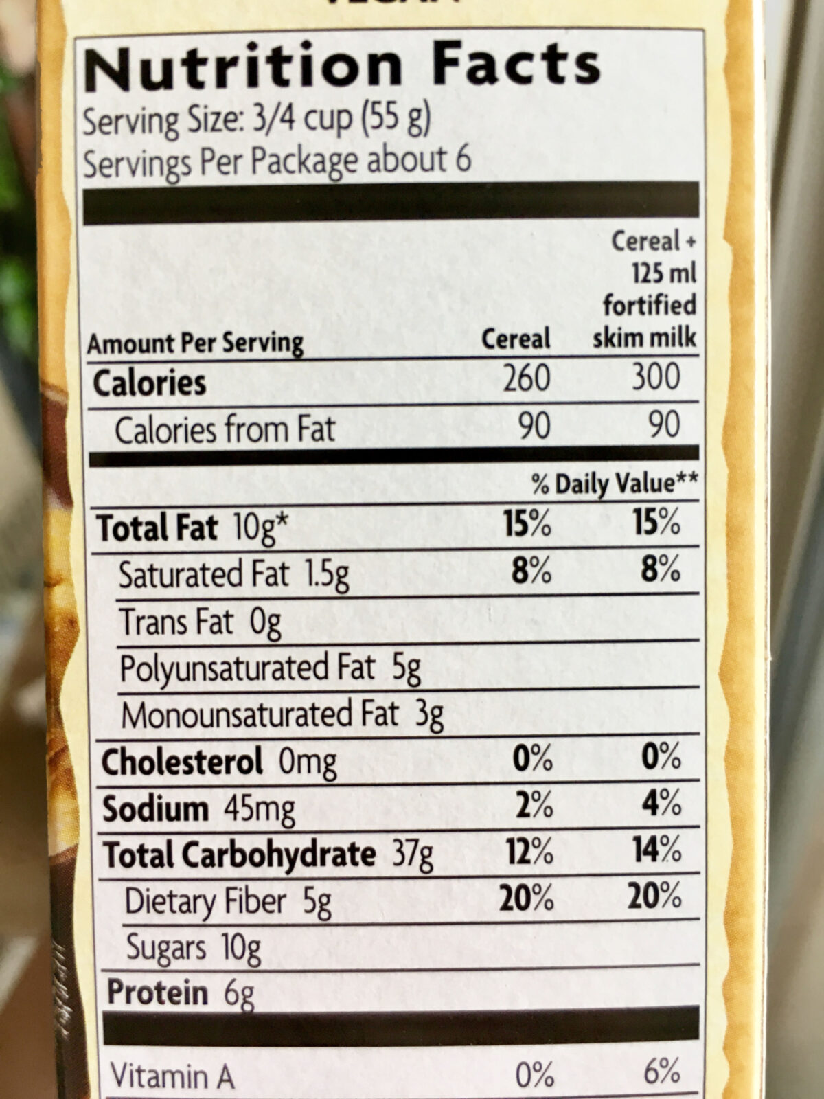 La imagen de la derecha muestra la etiqueta nutricional de una caja de granola. Hay 10 gramos de azúcar en una porción de 3/4 de taza. Trate de observar algunos de los alimentos que compra con regularidad, y reemplácelos posteriormente con alternativas que contengan menos o nada de azúcar agregado.
