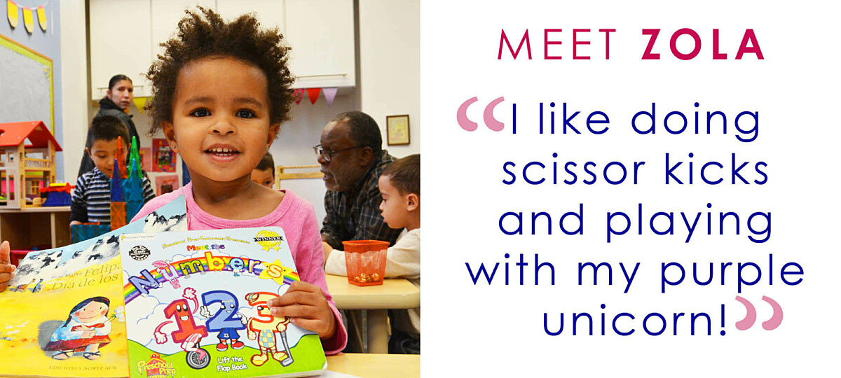 The Koalas classroom recently welcomed three-year old Zola into their class. Every day she tells Mom about how much she loves her teachers Ms. Tami, Ms. Nicole, and Mr. Anthony. She even does a spot on impression of Mr. Anthony! At school Zola is super active. During circle time, she loves doing scissor kicks before she sits and joins her class as they hear about today's lessons from Ms. Tami. When it's time for recess, Zola and her friends enjoy playing tag upstairs on CentroNía's rooftop playground. On very special days, Zola brings her favorite purple unicorn to class and introduces her to her friends! When it's time for an energy boost, Zola enjoys snacking on broccoli, strawberries, or grapes.After a rejuvenating nap, it isn't long before Zola is picked up by her mom to go home for the night. As much as Zola loves school and her teachers, she says the BEST part of her day is spending time with her "best friends" - her mom and sister. And when bedtime finally arrives, Zola and her family finishes the night reading her favorite book, "Meet the Numbers".